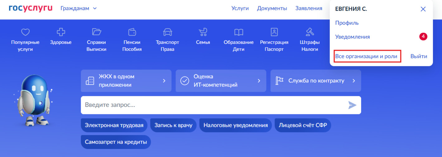 Зарегистрируйте на Госуслугах фирму: нажмите на кнопку с инициалами в правом верхнем углу, далее перейдите в раздел «Все организации и роли»