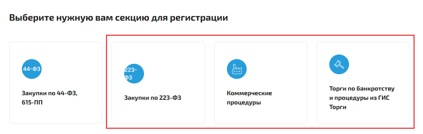 Выберите вид торгов, в которых планируете участвовать и нажмите «Зарегистрироваться на ЭТП».