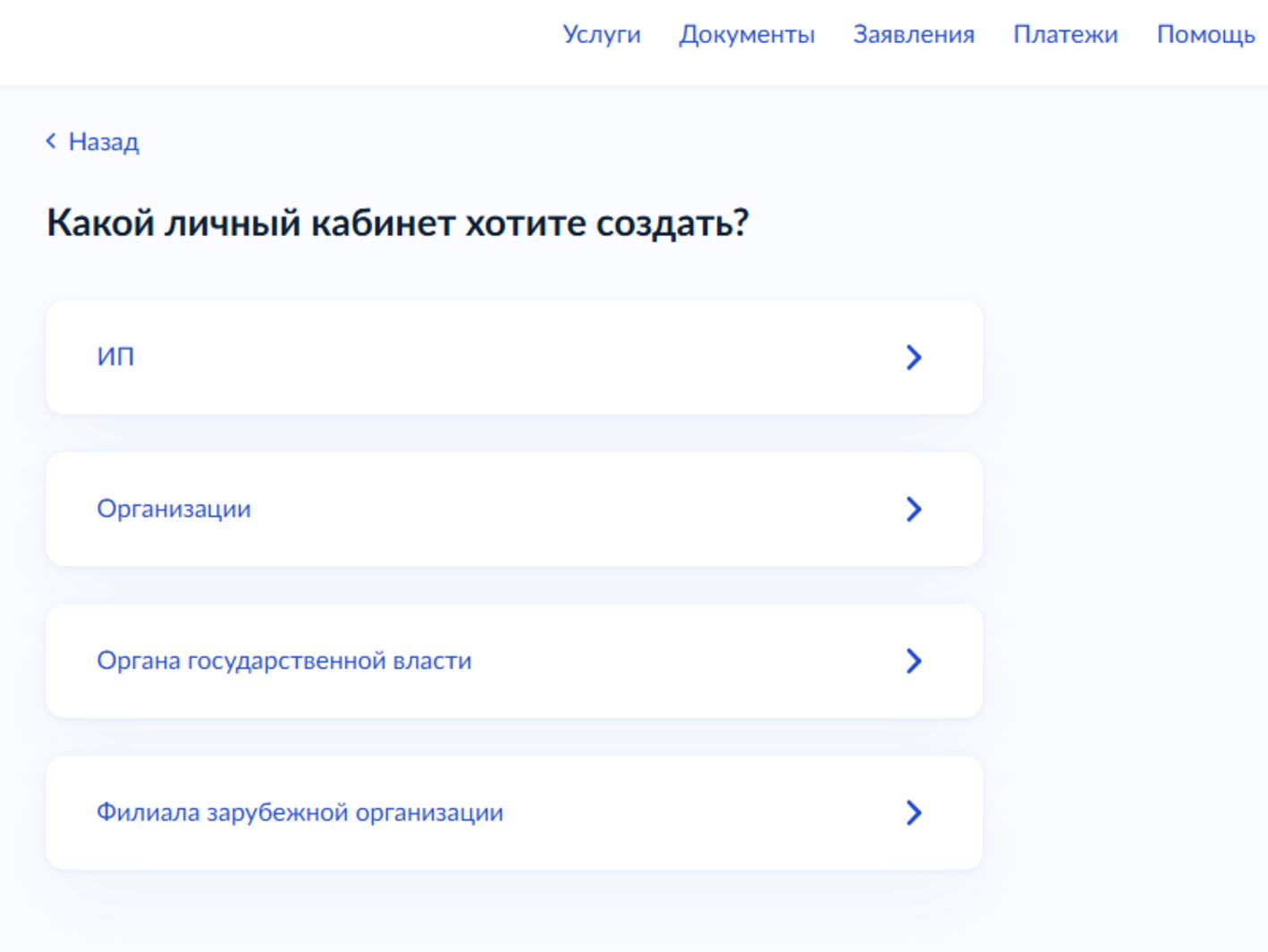 Регистрация пользователя на Госуслугах - В открывшемся окне нажмите кнопку «Создать» и выберите нужный вариант личного кабинета: ИП или организации.