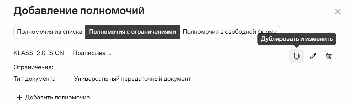 - Если нужно добавить несколько похожих по условиям полномочий, после создания первого нажмите на значок «Дублировать и изменить». Будет создана копия, которую можно отредактировать.